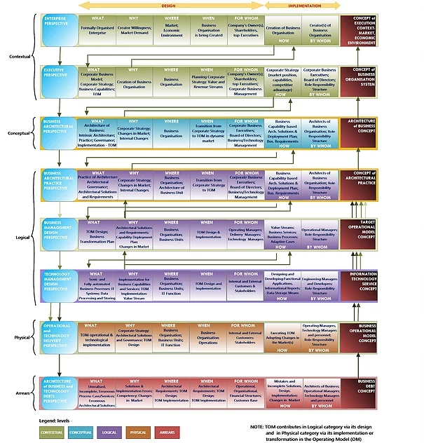 As the Figure 1 illustrates, an enterprise is described in a table with 6 rows and 7 columns. Each row represents particular perspective reflected in the related concept. The upper row is realised by the lower row (except Engineering and Technology perspectives that complement each other). The concepts (with the same exception) support other concepts in the reversed order. Actually, this relationship top-down/bottom-up relationships are presented in a few known models including the Zachman Framework™ ontology and POET-PIAF framework […]. Each upper row is also a cause for the existence of the lower row, which is also known as a Cause Pyramid where the lower level specifies what is needed in order to realise the upper level.