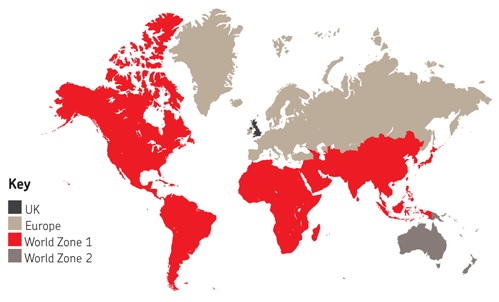 World Zone 1 generally covers countries in North America, South America, Africa, the Middle East, the Far East and South East Asia.