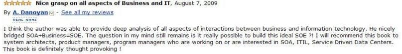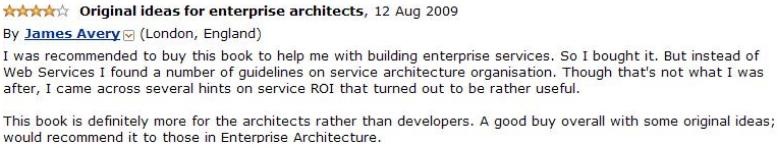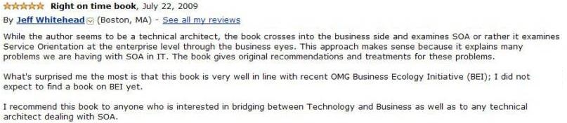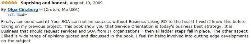 “This book perfectly reflects the current way of advancing in the computer science…” (click the title to see the full review) “This book perfectly reflects the current way of advancing in the computer science – the author is debating a lot of topics with a lot of people. Quotes are thoroughly analysed and supplied by contra-arguments. The whole book is a dynamic discussion similar to the work of an SOA consultant who should be able to discuss any question and any opinion about SOA. Logically the book is stimulating the reader to follow the same rule – debating the author’s position. I found this great. Anyone who is touching SOA should read this book to derive his/her own opinion.”